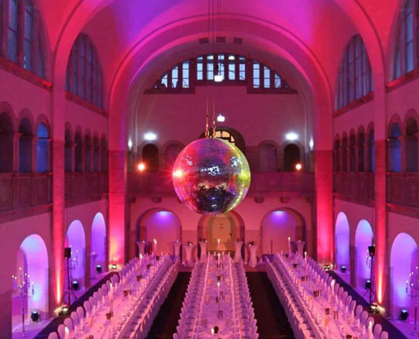 In der Location ist bereits eine veranstaltungstechnische Ausstattung vorhanden, die Sie mieten können. Somit können Sie der eindrucksvollen Neorenaissance-Halle durch verschiedenfarbige Beleuchtungen eine wunderschöne Atmosphäre verleihen. Die Schwimmhalle verfügt außerdem über Lautsprecher und Mikrophone für Ihre Hochzeitsband oder Ansprachen, sowie über Leinwand und Beamer, falls Sie auf Ihrer Hochzeit in Berlin Bilder oder ein Video zeigen möchten.