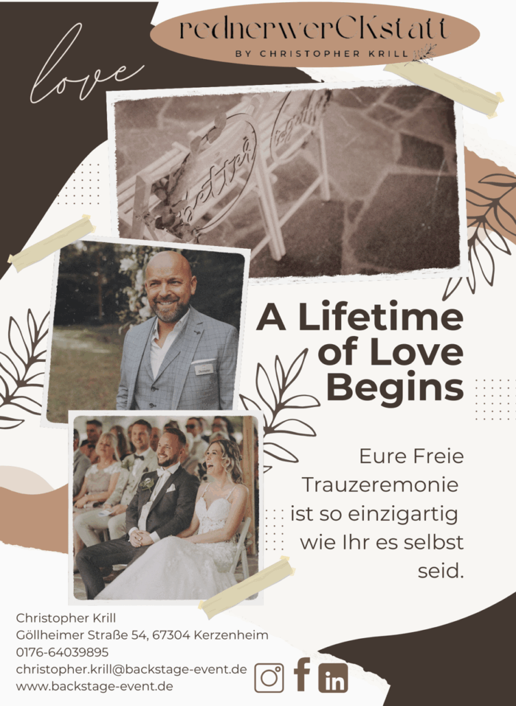 Ich bin mehr als nur ein freier Redner – ich bin ein Begleiter in den Höhen und Tiefen des Lebens. Mit meinem empathischen Ansatz und meiner langjährigen Erfahrung versuche ich, egal zu welchem Anlass, jede Feier zu etwas ganz Besonderem zu machen.