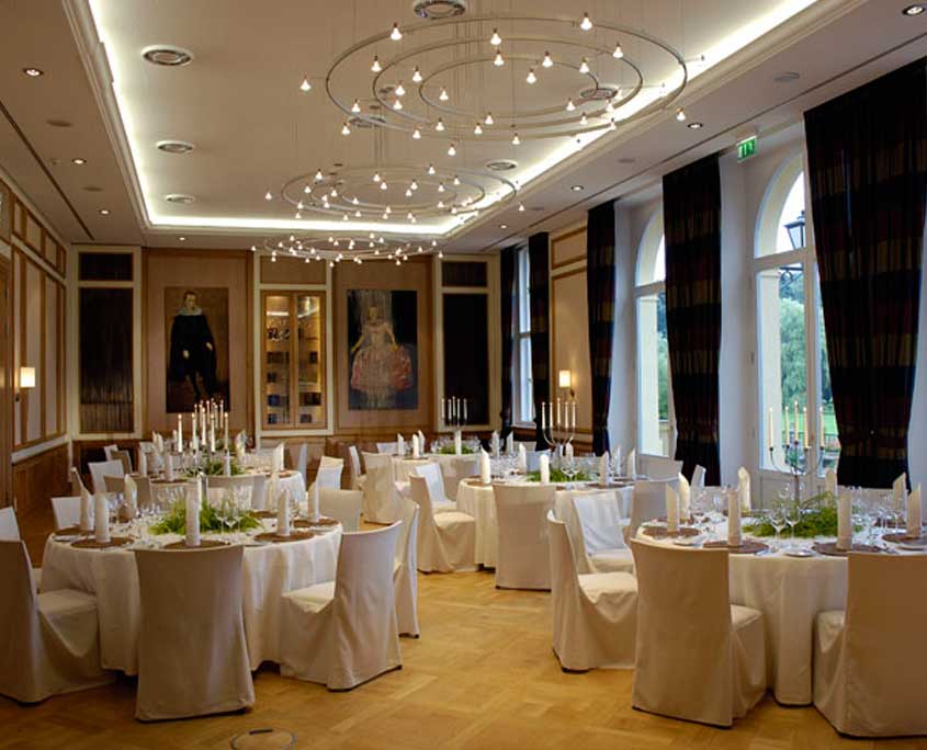 Modern und glamourös: Der Schloss-Saal mit angrenzender Terrasse und dem herrlichen Blick in den Schlosspark eignet sich für bis zu 80 Personen.
